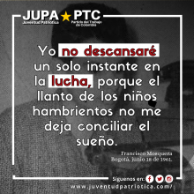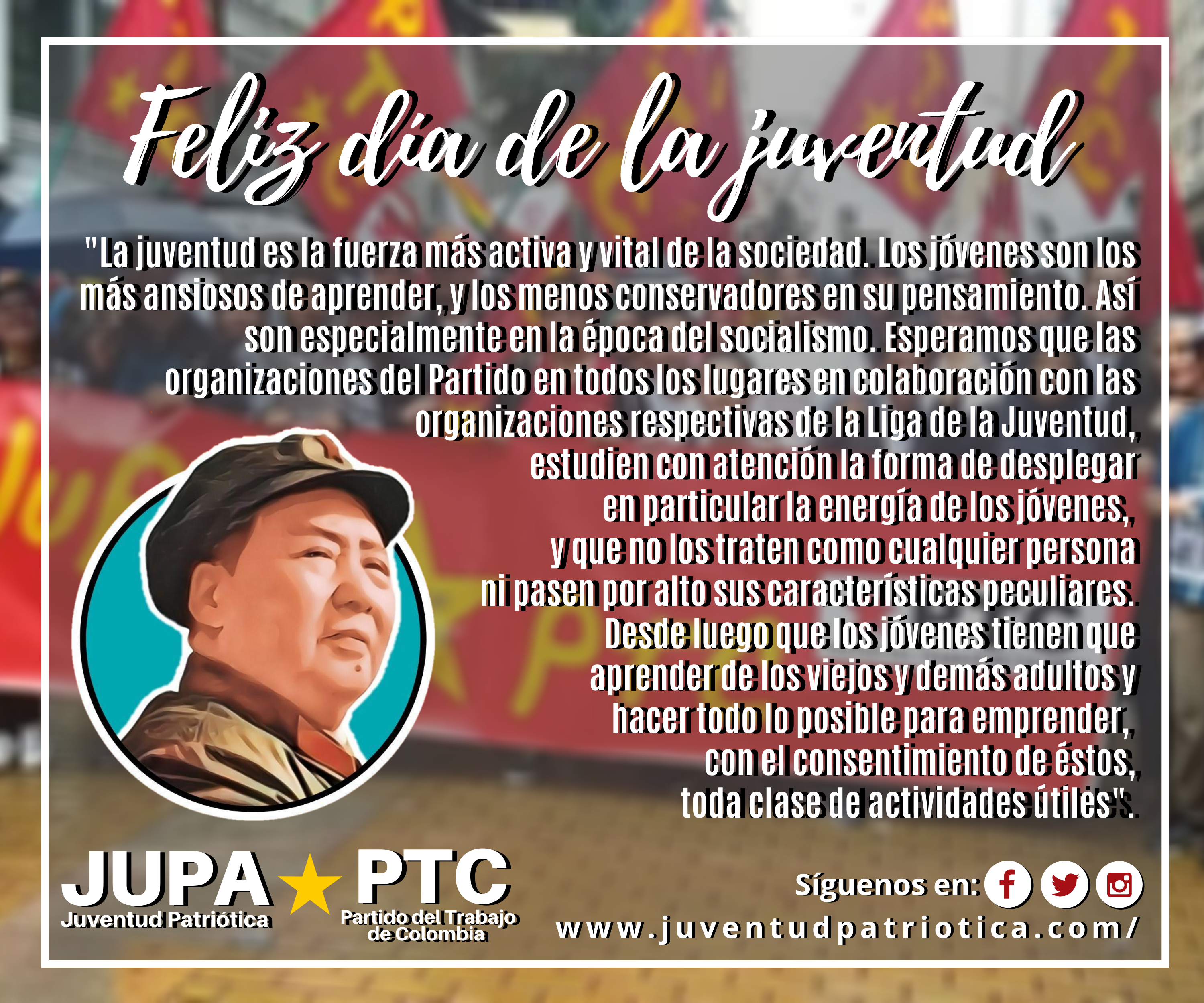 Hoy en el día de la juventud, agradezco especial e infinitamente a la Juventud Patriótica del Partido del Trabajo de Colombia, por la fuerza con que cada día se levantan a construir organización, a construir partido por y para Colombia. Un abrazo fraterno a todos y sigamos a fondo luchando porque en esta coyuntura Colombia tenga Gobiernos para su gente.